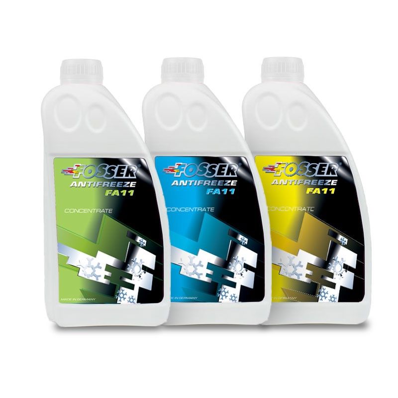 FOSSER Antifreeze FA 11 is an economical corrosion inhibitor and anti-freeze agent concentrate for radiators in water-cooled vehicles. The product is free of nitrite, amines and phosphates. FOSSER Antifreeze FA 11 provides excellent frost and corrosion protection all year round. The product does not have any negative effect on coolant hoses or cylinder head gaskets. It is available in the colors blue, yellow and green.